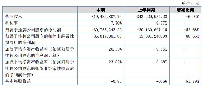 報(bào)告期內(nèi),公司實(shí)現(xiàn)營(yíng)業(yè)收入31,948.28萬(wàn)元,較上年同期減少2,374.71萬(wàn)元,增長(zhǎng)率-6.92%;凈利潤(rùn)-3,151.33萬(wàn)元,較上年同期增加虧損1,249.95萬(wàn)元,同比增虧65.74%。報(bào)告期末,公司總資產(chǎn)58,754.19萬(wàn)元,較上年期末減少1,414.17萬(wàn)元,增長(zhǎng)率-2.35%;凈資產(chǎn)17,453.96萬(wàn)元,較上年期末減少3,474.85萬(wàn)元,增長(zhǎng)率-16.60%。?
