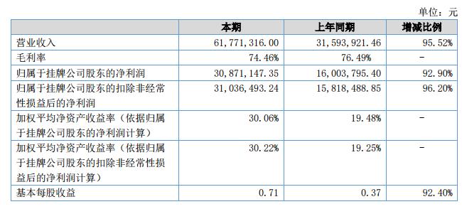 報(bào)告期內(nèi),公司實(shí)現(xiàn)營(yíng)業(yè)收入6,177.13萬(wàn)元,與上年同期相比增長(zhǎng)95.52%;凈利潤(rùn)方面:報(bào)告期內(nèi)公司實(shí)現(xiàn)凈利潤(rùn)3,087.11萬(wàn)元,較去年同期1,600.38萬(wàn)元增長(zhǎng)92.90%。?
