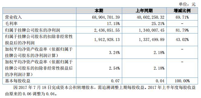 本期營業(yè)收入68,904,701.39元,較上年同期增加28,302,451.07元,增加69.71%;本期歸屬于掛牌公司股東的凈利潤為2,436,051.55元,較上年同期增加盈利1,096,044.10元,增加81.79%。?