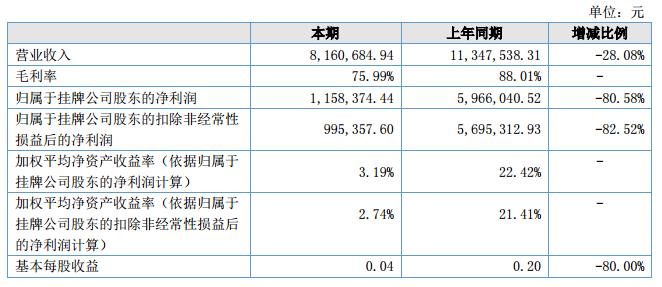 報告期內,公司實現營業(yè)收入8,160,684.94元,較上年同期減少28.08%,主要原因系公司大客戶中國食品藥品檢驗院自2018年開始對供應商政策采取競標模式,政策執(zhí)行初期,其內部采購結算流程不明確,致使報告期內對其銷售收入減少了52.42%。歸屬于掛牌公司股東的凈利潤1,158,374.44元,較上年同期減少80.58%,報告期內營業(yè)收入比同期減少28.08%,毛利率因研發(fā)創(chuàng)新等投入的增加減少了12.02%,收入和毛利率的減少是影響凈利潤減少的主要原因。?