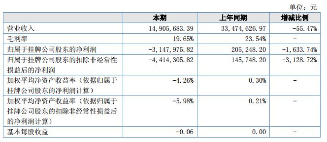 本期公司實(shí)現(xiàn)營(yíng)業(yè)收入1,490.57萬(wàn)元,較上年同期3,347.46萬(wàn)元下降55.47%,主要是因?yàn)?8年新年在2月份,17年新年在1月份,導(dǎo)致訂單貨期推遲了一個(gè)月左右,重要客戶的大部分產(chǎn)品主要在7月份開(kāi)始才陸續(xù)出貨,因此本期確認(rèn)的收入大幅下降;營(yíng)業(yè)成本1,197.61萬(wàn)元,較上年同期2,559.51萬(wàn)元下降53.21%,營(yíng)業(yè)成本的下降趨勢(shì)與銷售收入減少保持一致;毛利率19.65%較上年同期23.54%下降3.89%;本年虧損314.80萬(wàn)元,主要是因?yàn)樯习肽赇N售規(guī)??s小,而部分成本費(fèi)用相對(duì)固定,公司盈利空間進(jìn)一步壓縮所致。?