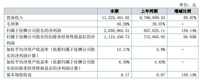報告期內公司的營業(yè)收入11,325,481.02元,比上年同期增加2,618,581.69元,相比于上年同期增加30.07%;公司的凈利潤2,051,019.51元,比上年同期增加1,193,394.40元,相比于上年同期增加139.15%。?