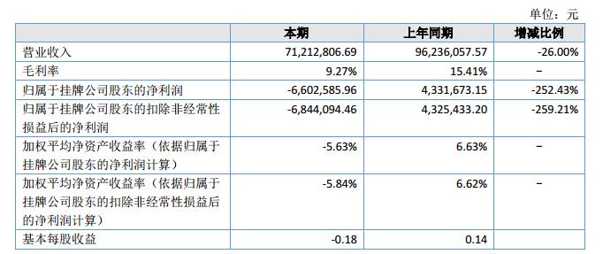 報(bào)告期內(nèi),公司實(shí)現(xiàn)營業(yè)收入7,121.28萬元,較去年同期9,623.61萬元下降26%;營業(yè)成本6,461.17萬元,較去年同期8,140.31萬元下降20.63%;歸屬于掛牌公司股東的凈利潤-660.26萬元,較去年同期433.17萬元減少252.43%;毛利率由15.41%下降至9.27%。
