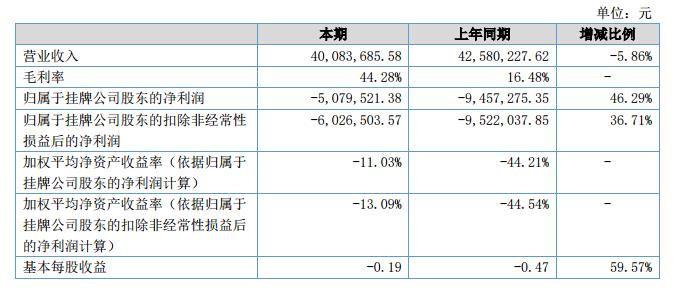 報告期內(nèi),公司主營業(yè)務(wù)未發(fā)生重大變動,2018年上半年,公司營業(yè)收入40,083,685.58元,同比下降5.86%%;歸屬母公司的凈利潤為-5,079,521.38元,較去年同期上漲4,377,753.97元。截至2018年6月30日,公司總資產(chǎn)為199,918,724.89元,凈資產(chǎn)為49,498,873.64元;公司上半年經(jīng)營性凈現(xiàn)金流為-9,661,296.29元,上年同期-14,923,722.78元,增加5,262,426.49元。?