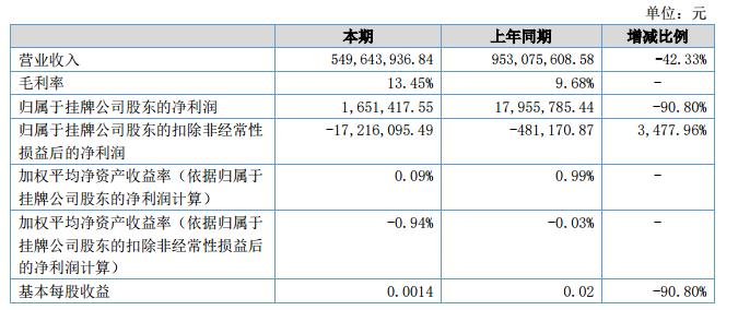 報(bào)告期內(nèi)公司實(shí)現(xiàn)營(yíng)業(yè)收入549,643,936.84元,同比下降42.33%;凈利潤(rùn)13,514,360.13元,同比下降64.26%;歸母凈利潤(rùn)1,651,417.55元,同比下降90.80%;扣非歸母凈利潤(rùn)-17,216,095.49元,同比下降3477.96%;毛利率13.45%,同比上升3.77個(gè)百分點(diǎn);截至2018年6月30日,公司總資產(chǎn)為2,818,951,592.21元,同比下降2.82%。?