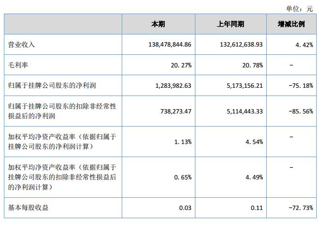 報告期內實現營業(yè)收入138,478,844.86元,較上年同期增長4.42%,營業(yè)成本110,410,318.87元,較上年同期增長5.10%,實現凈利潤1,283,982.63元,較上年同期下降75.18%。