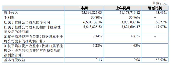 報告期內(nèi)公司實現(xiàn)營業(yè)收入73,399,825.03元,同比增長43.43%;凈利潤為6,601,138.36元,同比增長66.27%。?