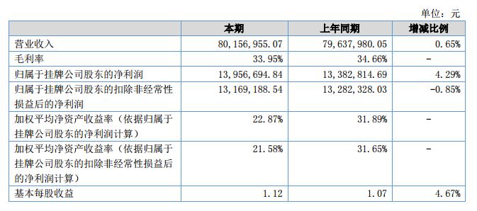 報(bào)告期內(nèi),公司經(jīng)營業(yè)績穩(wěn)定,公司實(shí)現(xiàn)營業(yè)收入8,015.70萬元,同比增長0.65%,利潤總額1,642.69萬元,同比增長3.39%,實(shí)現(xiàn)凈利潤1,395.67萬元,同比增長4.29%,經(jīng)營活動(dòng)產(chǎn)生的現(xiàn)金流量凈額為1,652.29萬元,同比增長23.55%。?