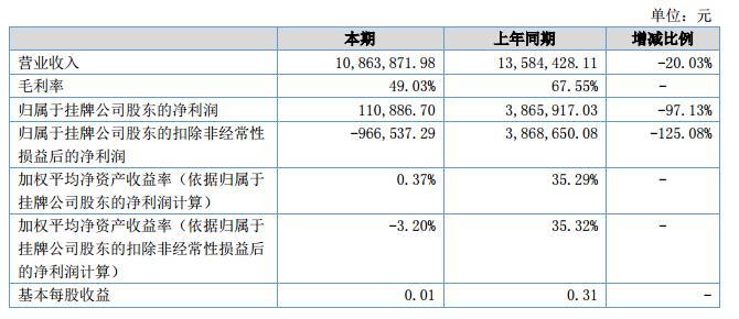 本期實現(xiàn)營業(yè)收入1,086.39萬元,相比上年同期減少了20.03%,凈利潤11.09萬元,相比上年同期減少了97.13%。?