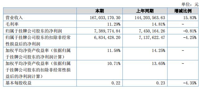報(bào)告期內(nèi)公司銷(xiāo)售167,033,170.30元與去年同期相比增長(zhǎng)15.83%;報(bào)告期內(nèi)實(shí)現(xiàn)凈利潤(rùn)7,389,774.84元與去年同期相比下降0.81%。