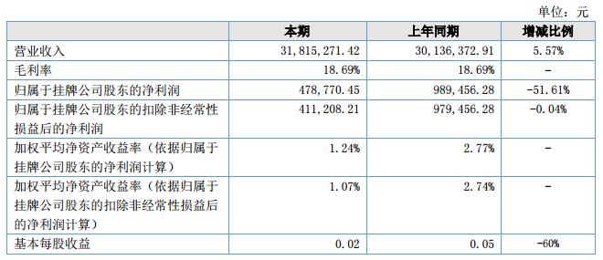 報告期內(nèi)實現(xiàn)營業(yè)收入31,815,271.42元,較去年營業(yè)收入上升5.57%;報告期內(nèi)實現(xiàn)凈利潤478,770.45元,比上年同期下降了40.47%。?