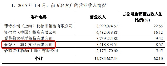 2017年12月,知韜股份披露的公開轉(zhuǎn)讓說明書顯示,在2017年1月至4月,赫燁(上海)是公司的第四大客戶,為公司帶來342萬元營收,占公司當(dāng)期營收的8.6%。