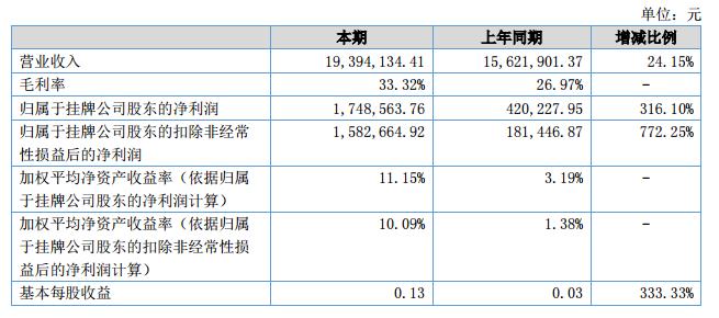 報(bào)告期內(nèi),公司實(shí)現(xiàn)營(yíng)業(yè)收入19,394,134.41元,上年同期實(shí)現(xiàn)營(yíng)業(yè)收入15,621,901.37元,同比增長(zhǎng)24.15%,營(yíng)業(yè)成本為12,931,456.56元,上年同期營(yíng)業(yè)成本為11,408,400.85元,同比增長(zhǎng)13.35%,毛利率33.32%,上年同期毛利率26.97%,同比增長(zhǎng)23.55%。?