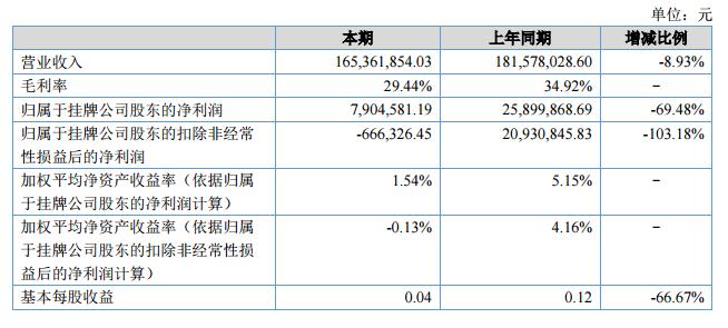 報(bào)告期內(nèi),公司實(shí)現(xiàn)營(yíng)業(yè)收入165,361,854.03元,其中主營(yíng)業(yè)務(wù)收入164,236,528.20元,其他業(yè)務(wù)收入1,125,325.83元;營(yíng)業(yè)收入比上年同期下降8.93%;報(bào)告期內(nèi),公司實(shí)現(xiàn)營(yíng)業(yè)成本116,682,937.00元,其中主營(yíng)業(yè)務(wù)成本為115,822,850.14元,其他業(yè)務(wù)成本為860,086.86元;營(yíng)業(yè)成本比上年同期下降1.26%;歸屬于掛牌公司股東的凈利潤(rùn)7,904,581.19元,比上年同期下降69.48%。?