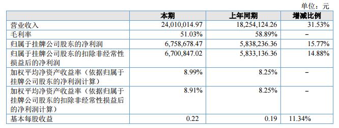 報告期內(nèi)公司實(shí)現(xiàn)營業(yè)收入24,010,014.97元,比上年同期增長31.53%,公司實(shí)現(xiàn)凈利潤6,758,678.47元,比上年同期增長15.77%。?