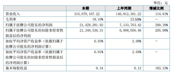 報(bào)告期內(nèi),公司實(shí)現(xiàn)銷售收入315,079,107.22元,比去年同期146,812,361.22元增長(zhǎng)114.61%;報(bào)告期內(nèi)凈利潤21,429,281.92元,比上年同期7,133,763.42元增加14,295,518.50元,增長(zhǎng)200.39%。?