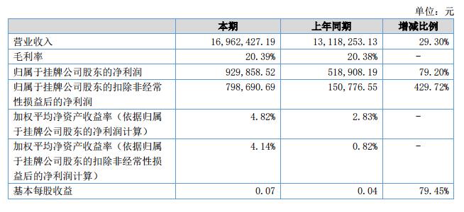 年公司實(shí)現(xiàn)營(yíng)業(yè)收入16,962,427.19元,上年同期13,118,253.13元,增幅29.30%。2018年上半年度資產(chǎn)總計(jì)39,941,320.48元,上年同期35,993,199.06元,增幅10.97%。2018年上半年度公司凈利潤(rùn)為929,858.52元,上年同期518,908.19元,增幅79.20%。?