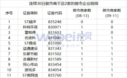 挖貝網(wǎng) 9月11日消息,截至今日,新三板做市商企業(yè)中,共44家的做市商家數(shù)不足2家,其中,11家企業(yè)做市商家數(shù)不足2家已連續(xù)30天。