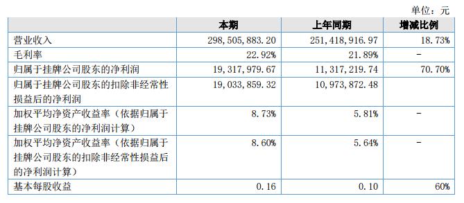報(bào)告期內(nèi)公司實(shí)現(xiàn)營業(yè)收入為29,850.59萬元,較上年同期25,141.89萬元,上升4,708.70萬元,增長比例為18.73%;營業(yè)成本23,008.70萬元,比去年同期增加了3,369.34萬元,較去年同期增加了17.16%。報(bào)告期內(nèi),公司整體毛利率為22.92%,去年同期為21.89%,上升1.03%;報(bào)告期內(nèi)公司實(shí)現(xiàn)凈利潤1,931.80萬元,較去年同期上升800.08萬元,同比增長70.70%。?