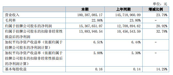 報(bào)告期內(nèi)歸屬于掛牌公司股東的凈資產(chǎn)24,373.79萬(wàn)元,較去年同期增長(zhǎng)6.73%,系報(bào)告期內(nèi)實(shí)現(xiàn)凈利潤(rùn)所致。公司營(yíng)業(yè)收入18,038.71萬(wàn)元,較去年同期增長(zhǎng)23.79%;營(yíng)業(yè)成本13,914.45萬(wàn)元,較去年同期增長(zhǎng)25.31%,報(bào)告期內(nèi)實(shí)現(xiàn)歸屬于掛牌公司股東的凈利潤(rùn)1,536.77萬(wàn)元,較去年同期上升20.92%。?