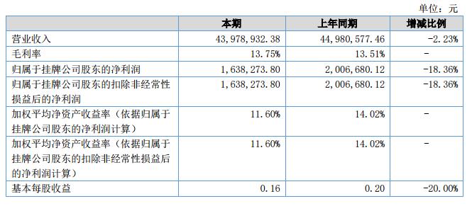 報(bào)告期內(nèi)公司實(shí)現(xiàn)營業(yè)收入43,978,932.38元,較去年同期下降2.23%;凈利潤1,638,273.80元,較去年同期下降18.36%;經(jīng)營活動(dòng)產(chǎn)生的現(xiàn)金流量?jī)纛~-2,533,414.29,較去年同期下降了235.00%。?