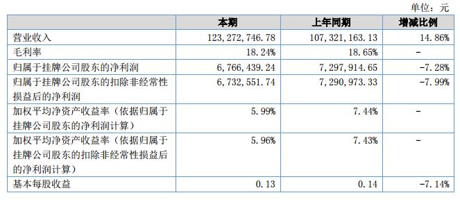 報告期內(nèi)公司實現(xiàn)營業(yè)收入12327.27萬元,較2017年的10732.12萬元增長14.86%。工程項目毛利率為18.24%,與上年同期基本持平。報告期實現(xiàn)凈利潤676.64萬元,較上年同期729.79萬元下降7.28%。?