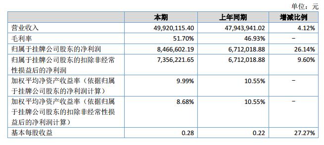 報(bào)告期內(nèi),實(shí)現(xiàn)營業(yè)收入4,992.01萬元,增幅4.12%,實(shí)現(xiàn)凈利潤846.66萬元,增幅26.14%,截至2018年6月30日,公司總資產(chǎn)10,240.85萬元,增幅8.23%,歸屬于掛牌公司股東的凈資產(chǎn)8,900.66萬元,增幅10.51%。?