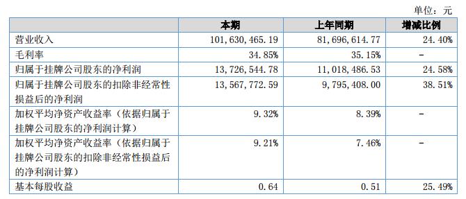 報(bào)告期內(nèi),公司實(shí)現(xiàn)營業(yè)收入10,163.05萬元,相較上年同期的8,169.66萬元,同比增長24.40%;公司實(shí)現(xiàn)凈利潤1,372.65萬元,相較上年同期的1,101.85萬元,同比上升24.58%。?