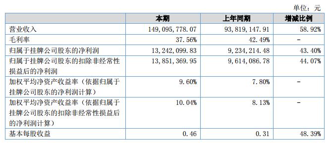 報告期內,公司實現營業(yè)收入14909.58萬元,同比增長58.92%;實現凈利潤1324.21萬元,同比增長43.4%。?