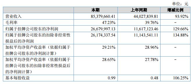 報告期內(nèi),公司營業(yè)收入85,379,660.41元,與上年同期44,027,839.81元的營業(yè)收入相比,增長了93.92%。公司凈利潤26,679,997.13元,與上年同期相比凈利潤增長129.66%,實現(xiàn)了大幅提高。為了能夠提供高效、精準的三維無損光學(xué)視覺檢測系統(tǒng),公司的研發(fā)投入逐年加大,以保證產(chǎn)品技術(shù)的進一步提升。報告期,公司研發(fā)費用支出1,940,401.76元,完成了公司制定的研發(fā)項目預(yù)期進度,公司產(chǎn)品的市場占有率也伴隨銷售收入的增長而進一步提高。?