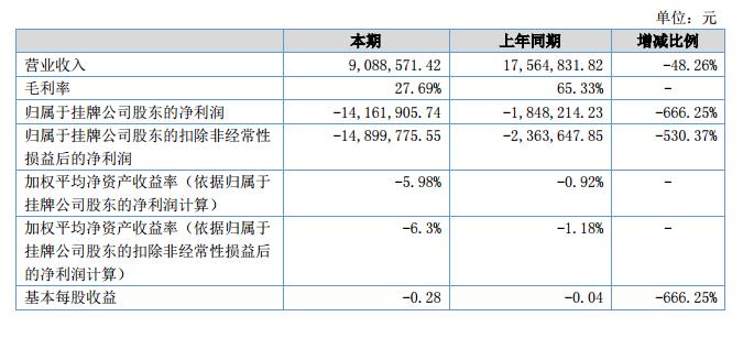 報(bào)告期內(nèi),公司的營業(yè)收入908.86萬元,同比下降48.26%;凈利潤-1,416.19萬元,同比下降666.25%。?