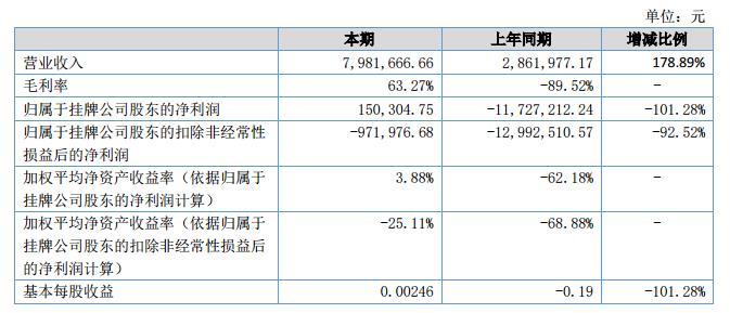 報(bào)告期內(nèi),公司實(shí)現(xiàn)營業(yè)收入7,981,666.66元,比去年同期增加5,119,689.49元,增長178.89%;營業(yè)成本2,931,476.14元,比去年同期減少2,492,481.81元,負(fù)增長45.95%:歸屬于掛牌公司股東的凈利潤150,304.75元,實(shí)現(xiàn)扭虧為盈?