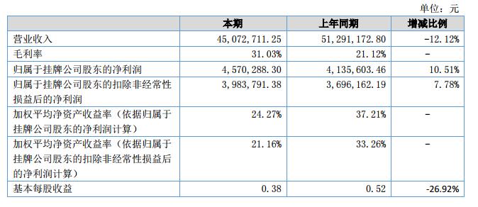 報(bào)告期公司營(yíng)業(yè)收入4,507.27萬(wàn)元,較上年同期下降621.85萬(wàn)元,同比下降12.12%;資產(chǎn)總額4,383.86萬(wàn)元,較上年同期增長(zhǎng)1,154.88萬(wàn)元,同比增長(zhǎng)35.77%;凈資產(chǎn)2,109.59萬(wàn)元,較上年同期增長(zhǎng)791.35萬(wàn)元,同比增長(zhǎng)60.03%;凈利潤(rùn)457.30萬(wàn)元,較上年同期增長(zhǎng)43.64萬(wàn)元,較上年同期增長(zhǎng)10.55%,毛利率31.03%,較上年同期增長(zhǎng)46.99%。?