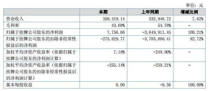 報告期內,公司實現(xiàn)營業(yè)收入358,319.14元,較上期增加25,370.42元,較上年同期增長7.62%,公司營業(yè)收入較上期增長較小;實現(xiàn)歸屬于掛牌公司股東的凈利潤7,758.66元,較上期增加3,657,670.11元,較上年同期增長100.21%。?