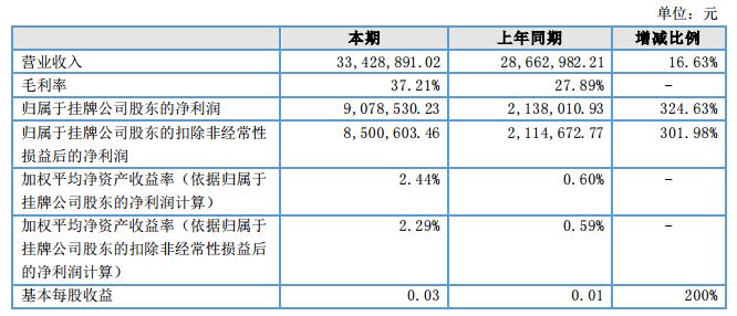 報告期內(nèi),公司營業(yè)收入3,342.89萬元,同比上升16.63%;實(shí)現(xiàn)歸屬于掛牌公司股東的凈利潤907.85萬元,同比大幅上升324.63%。?