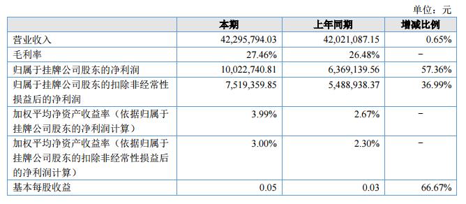 報(bào)告期內(nèi)公司實(shí)現(xiàn)營(yíng)業(yè)收入4229.58萬(wàn)元,同比2017年的4202.11萬(wàn)元增長(zhǎng)0.65%;實(shí)現(xiàn)利潤(rùn)總額1,113.98萬(wàn)元,同比749.31增長(zhǎng)49.00%;凈利潤(rùn)1,002.27萬(wàn)元,同比636.91萬(wàn)元增長(zhǎng)57%。?