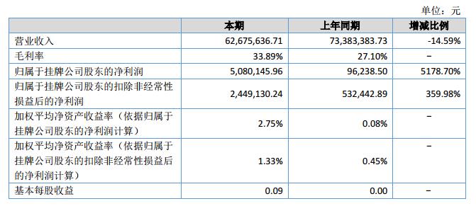 報(bào)告期內(nèi)公司實(shí)現(xiàn)營(yíng)業(yè)收入6,267.56萬元,同比下降14.59%;凈利潤(rùn)508.01萬元,同比增長(zhǎng)5178.70%。截至2018年6月30日,公司總資產(chǎn)為23,477.50萬元,同比增長(zhǎng)6.21%;歸屬于掛牌公司股東的凈資產(chǎn)為18,721.22萬元,同比增長(zhǎng)2.79%。?
