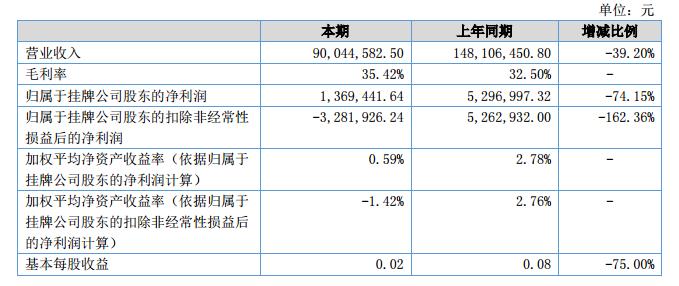 報告期內(nèi),公司實現(xiàn)營業(yè)收入90,044,582.50元,相比上年同期下降39.20%;營業(yè)成本為96011929.89元,相比上年同期下降34%;實現(xiàn)凈利潤1,369,441.64元,相比上年下降74.15%。凈利潤相較去年同期下降由于公司整體仍處于業(yè)務轉(zhuǎn)型期所導致。
