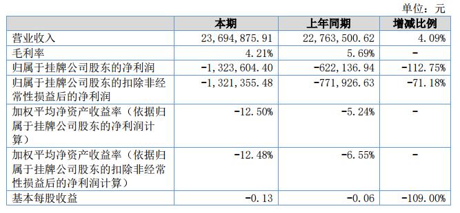 2018年上半年,公司的營(yíng)業(yè)總收入為23,694,875.91元,比上年同期增加931,375.29元,增長(zhǎng)4.09%;實(shí)現(xiàn)凈利潤(rùn)-1,323,604.40元,比上年同期減少701,467.46元,減少112.75%。?