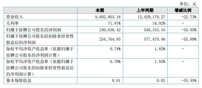 報(bào)告期內(nèi),公司實(shí)現(xiàn)營業(yè)收入9,602,803.18元,較去年同期下降22.73%。主要原因?yàn)楣?018年第二季度實(shí)施的項(xiàng)目尚未完成。公司營業(yè)成本為2,691,307.50元,,較去年同期下降66.72%,毛利率較去年同期上漲37.05%。?