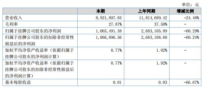 報告期內(nèi)公司實現(xiàn)營業(yè)收入8,921,897.85元,同比下降24.48%,實現(xiàn)凈利潤1,065,491.38元,同比下降60.29%。?