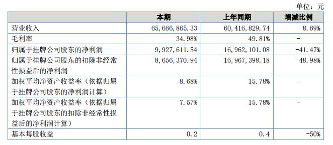 公司在報(bào)告期內(nèi)的主營業(yè)務(wù)收入為65,666,865.33元比上期增長8.67%;營業(yè)成本為42,696,877.14元,比上期增長40.82%;歸屬于母公司的凈利潤為9,927,611.54元,比上期減少41.47%。?