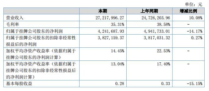 報告期內(nèi),公司營業(yè)收入27,217,996.27元,同比增長10.08%;營業(yè)成本17,608,650.43元,同比增長15.94%;凈利潤4,241,687.93元,同比下降14.17%;資產(chǎn)總額40,356,535.86元,比上年度末增長14.45%;負債總額8,881,806.71元,比上年度末增長10.65%;所有者權(quán)益總額31,474,729.15元,比上年度末增長15.58%;經(jīng)營活動產(chǎn)生的現(xiàn)金流量凈額2,464,230.46元,同比增長89.54%。?
