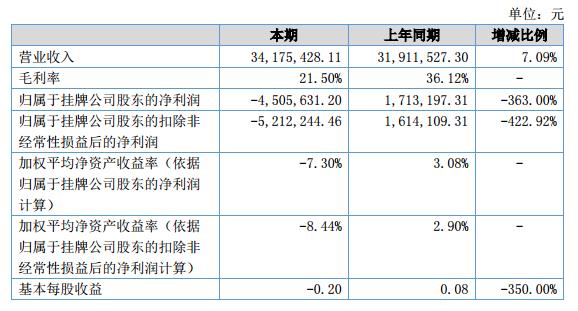 報告期,公司實現營業(yè)收入34,175,428.11元,同比上升7.09%;歸屬于母公司所有者的凈利潤-4,505,631.20元,同比下降363%;經營活動產生的現金流量凈額-8,462,753.79元,同比上升47.92%。?