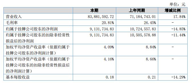 報(bào)告期內(nèi),公司營(yíng)業(yè)收入83,881,592.72元,上年同期營(yíng)業(yè)收入71,184,743.01元,本期同比增長(zhǎng)17.84%;凈利潤(rùn)9,131,734.83元,比上年同期10,724,557.83元下降,下降比例為14.85%,其主要原因?yàn)樵撼杀旧仙?018年均價(jià)451元/噸比2017年均價(jià)426元/噸上升了5.87%。?