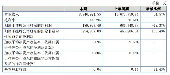 公司實現(xiàn)營業(yè)收入8,946,921.55元,較上年同期減少4,726,838.19元;營業(yè)成本4,939,710.62元,較上年同期減少4,562,530.18元。?