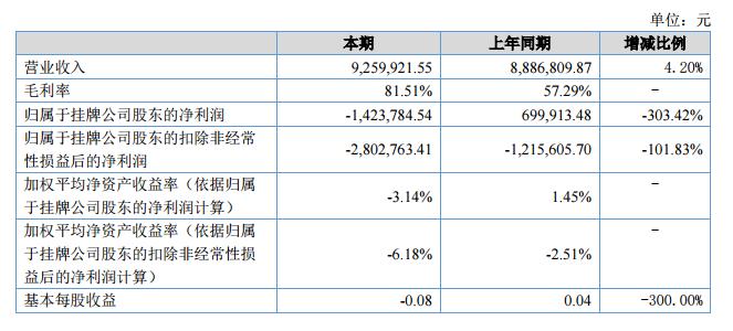 報(bào)告期內(nèi),公司營業(yè)收入926.00萬元,較上期增加4.2%,營業(yè)成本171.17萬元,較上期減少54.90%,營業(yè)成本降低主要原因系公司報(bào)告期內(nèi)以自產(chǎn)試劑銷售為主,未銷售毛利潤較低的檢測儀器設(shè)備,故毛利率較上年同期提高81.51%;本期凈利潤-142.38萬元,較上期減少303.42%,費(fèi)用增加主要系公司改變銷售模式,引入第三方專業(yè)銷售服務(wù)公司,及公司管理層決定2018年開展生殖毒理檢測試劑盒產(chǎn)業(yè)化項(xiàng)目,前期投入費(fèi)用較多。?
