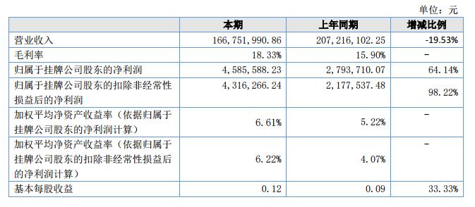 2018年上半年公司實現(xiàn)營業(yè)收入16,675.20萬元,與去年同期相比減少4,046.41萬元,同比下降了19.53%。實現(xiàn)利潤458.56萬元,與去年同期相比增加179.19萬元,同比增長64.14%。?