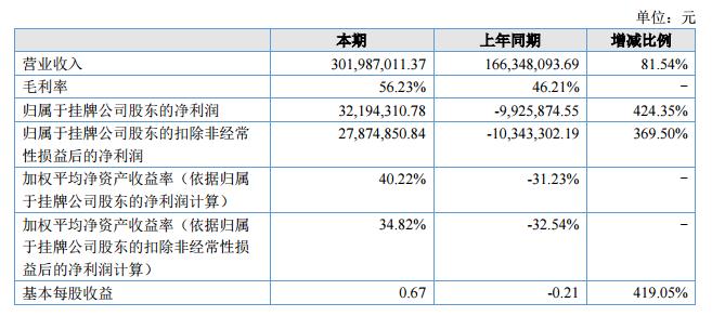 報告期內(nèi),公司實現(xiàn)營業(yè)收入30,198.70萬元,同比增長了81.54%;營業(yè)利潤3,931.80萬元,同比增長了715.54%;凈利潤為3,204.40萬元,同比增長了423.09%。截止2018年06月30日,公司注冊資本4,855萬元,總資產(chǎn)為42,688.28萬元,總資產(chǎn)增長率40.83%;凈資產(chǎn)為10,225.50萬元,凈資產(chǎn)增長率70.60%。?