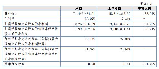 報(bào)告期內(nèi)實(shí)現(xiàn)營(yíng)業(yè)收入7,144.25萬元,較上年同期營(yíng)業(yè)收入增長(zhǎng)56.97%,歸屬于母公司股東的凈利潤(rùn)1,226.87萬元,較上年同期增長(zhǎng)34.20%。?